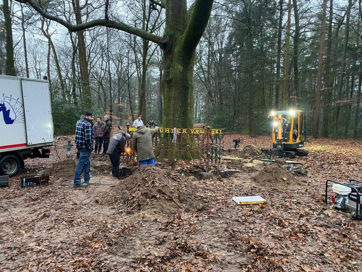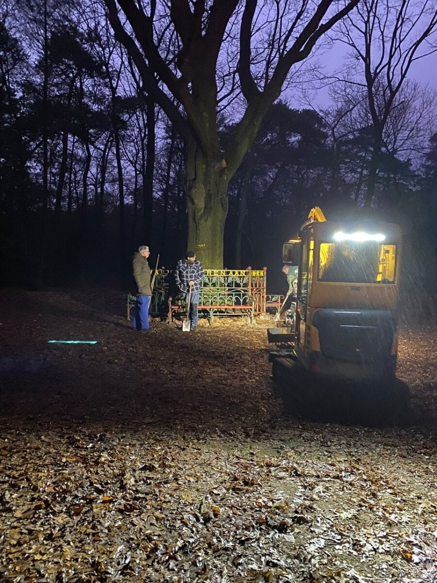 Om 8.00 uur op zaterdag 13 januari 2024 is het al een drukte van belang in het buurtbos. Het is hoog tijd voor groot onderhoud aan de gedenkbank van het Luntersche Buurtbosch. Een aantal vrijwilligers demonteren met de grootste precisie de monumentale bank welke rondom de historische eik stond. De bank wordt volledig gestraald, bijgewerkt en opnieuw gecoat zodat deze binnenkort terug geplaatst kan worden en weer minimaal 110 jaar meegaat.