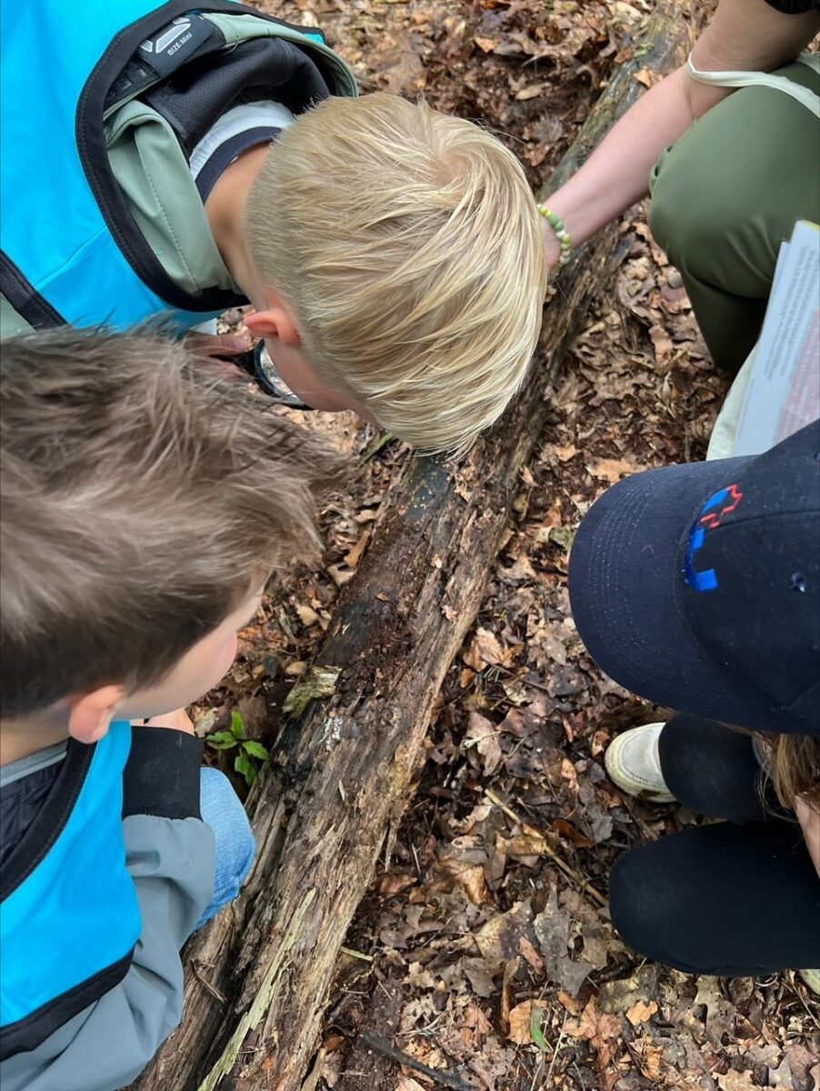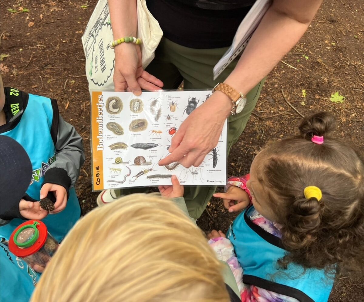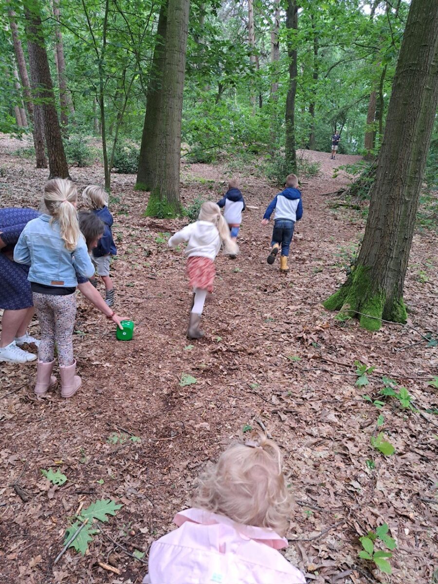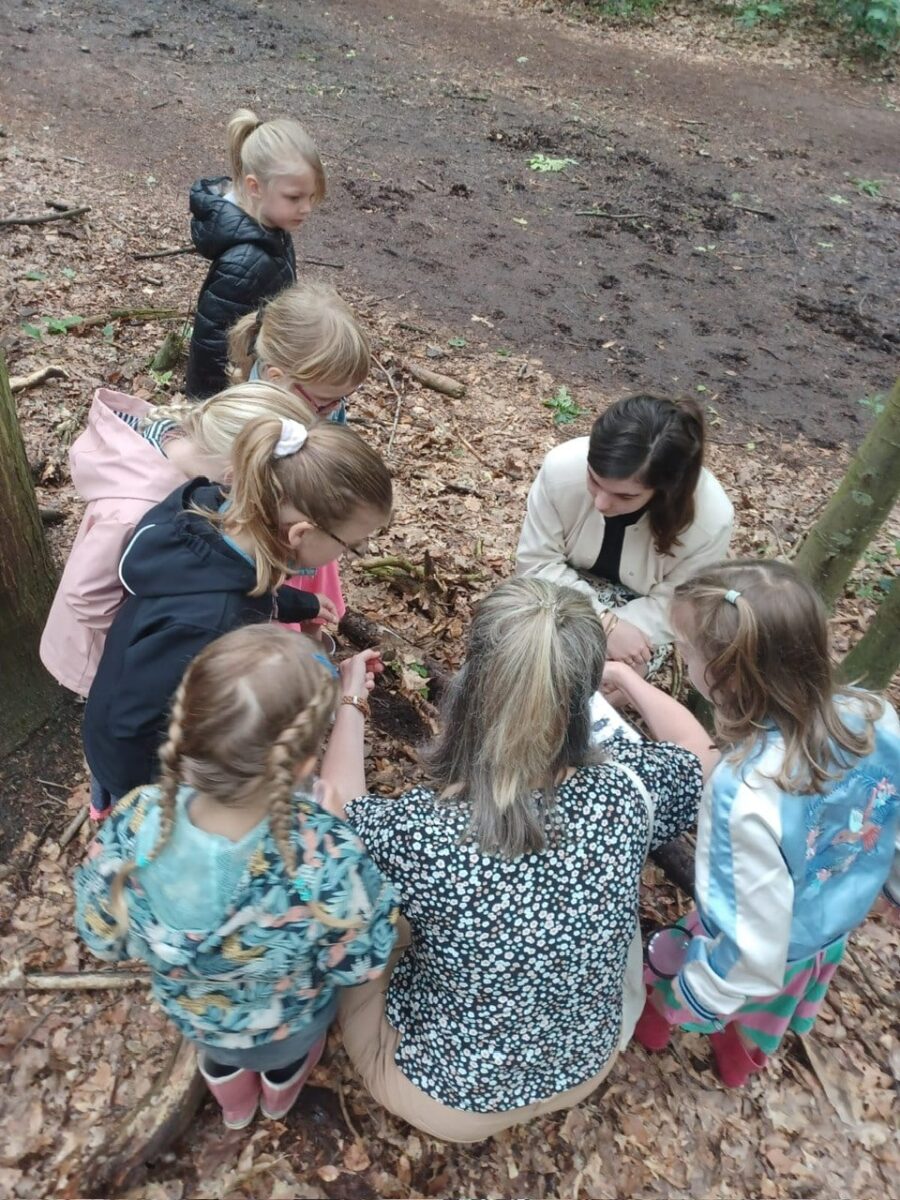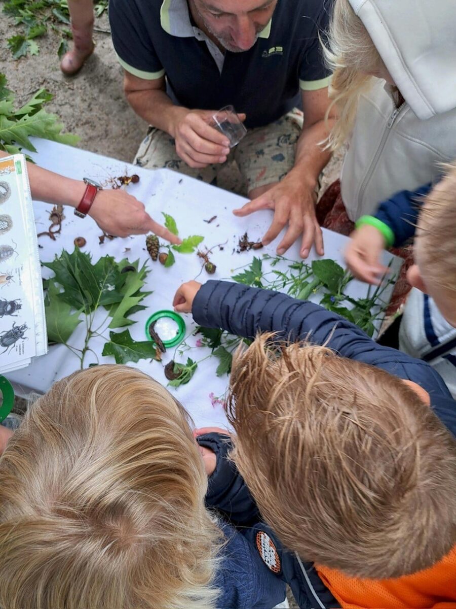 In het bos werd er in kleine groepjes een half uur gewandeld met een boswachter. Luisteren met de ogen dicht naar de bosgeluiden, lekker in de bosgrond wroeten en in bladeren graaien om kriebelbeestjes te zoeken. Met spiegels werd de onderkant van bladeren bekeken, met vergrootglazen werd mos van dichtbij bekeken. Insectenpotjes werden volgestopt met allerlei kruipende bosbewoners. Deze werden vervolgens met vergrootglazen nader bestudeerd. De een slaakt een luide “ieeeeuw” uit bij het zien en voelen van een naaktslak en de ander is mateloos gefascineerd door het voortbewegen van de worm en de snelheid van een kever. Na afloop wordt alles natuurlijk weer netjes teruggezet in de natuur.