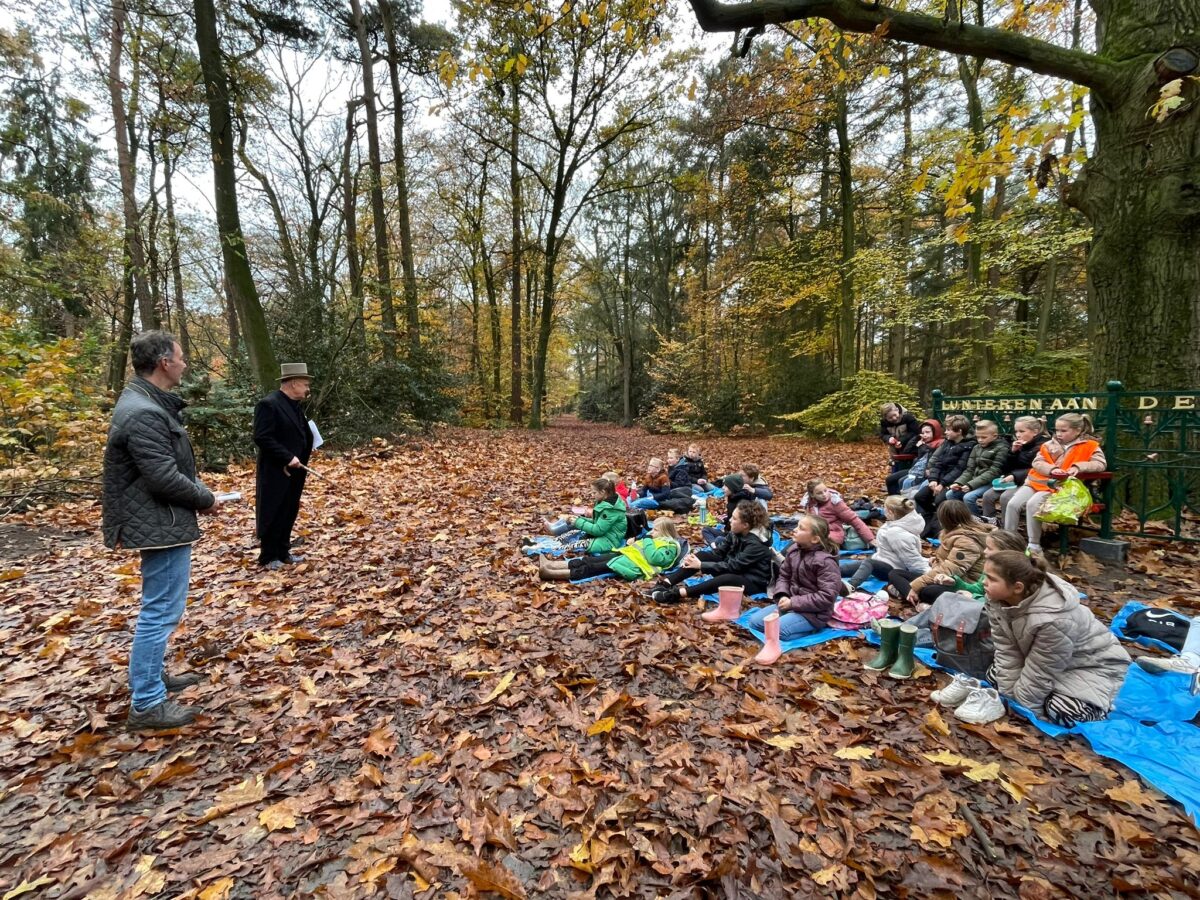 Op vrijdag 14 december was juf Lisa met haar groep 6 van SmdB De Bron op bezoek in het bos. Terwijl de kinderen lekker zaten te lunchen rond de prachtige gedenkbank werd hen een verhaal verteld over de geschiedenis van het bos. Het verhaal was nog maar net begonnen of er kwam een grote verrassing het verhaal ingelopen: Notaris Van den Ham in hoogst eigen persoon.