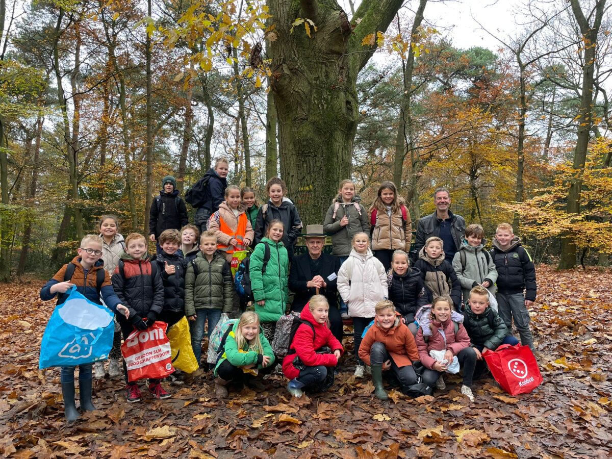 Na afloop werd er nog een foto gemaakt van dit unieke moment en gingen de kinderen in het bos nog zelf “een blad lopen” van het bladenpatroon waarin ons bos is aangelegd. Tijdens deze wandeling werden er materialen gezocht voor van een natuur-kijkdoos, die ze later op school zouden gaan maken.