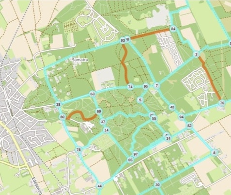 De knooppunten zijn dmv eikenhouten palen goed aangegeven.